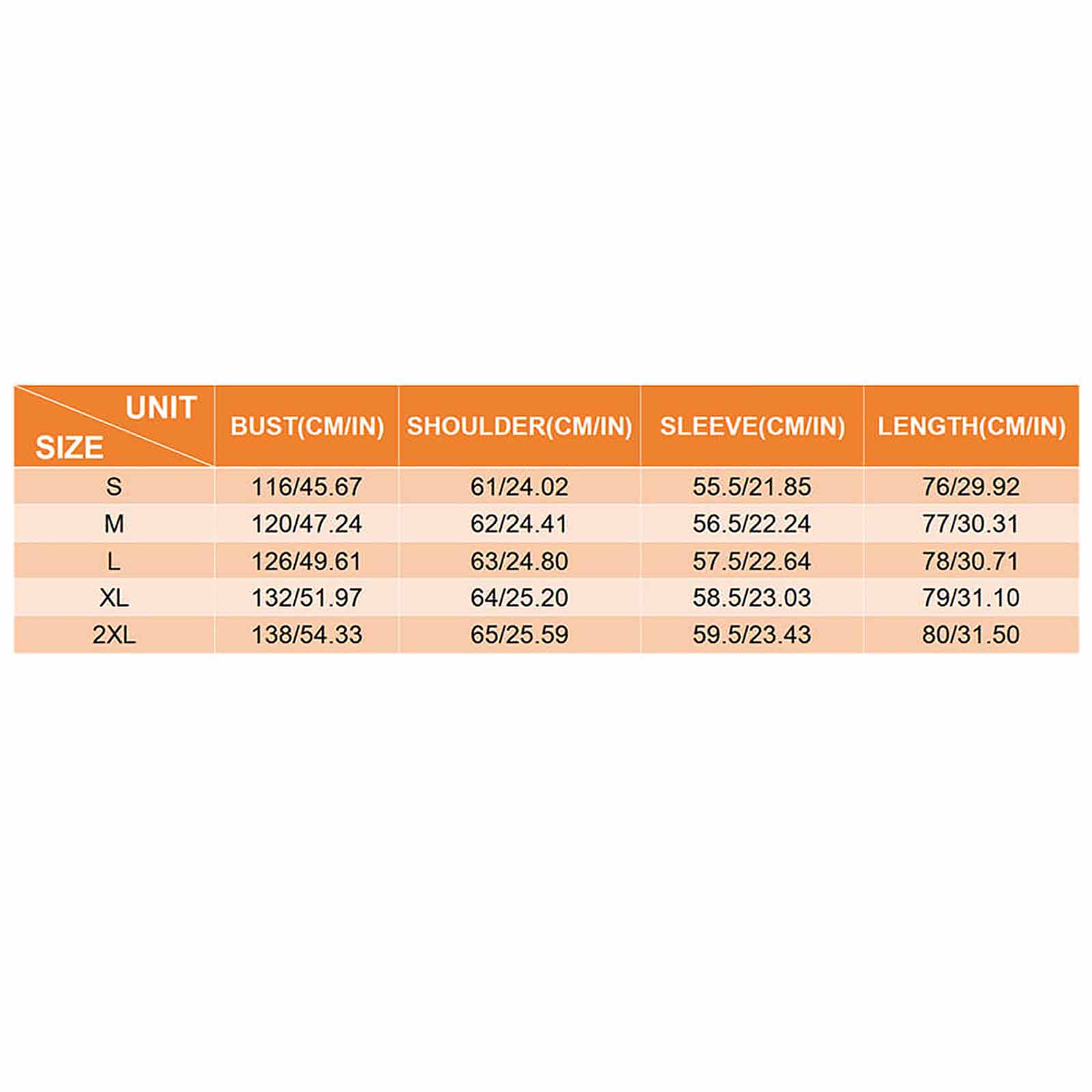 2XL | 138/54.33 | 65/25.59 | 59.5/23.43 | 80/31.50 |