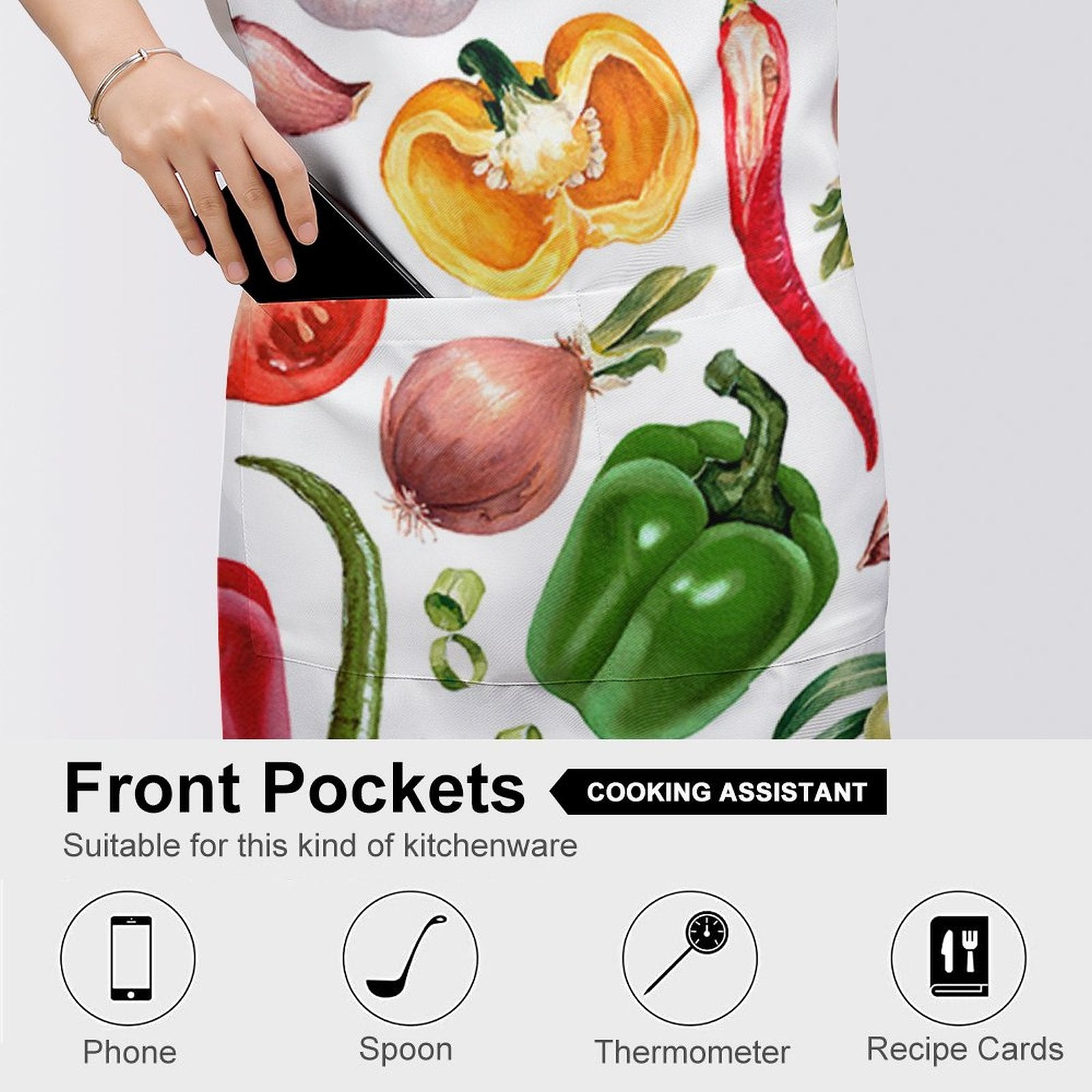 Un creatore ha bisogno dei suoi strumenti a portata di mano. Ecco perché abbiamo integrato due ampie tasche frontali posizionate strategicamente all'altezza naturale delle mani. Perfette per il telefono (per seguire le ricette o ascoltare musica), il termometro da cucina, le bustine di spezie o le cesoie da giardino.