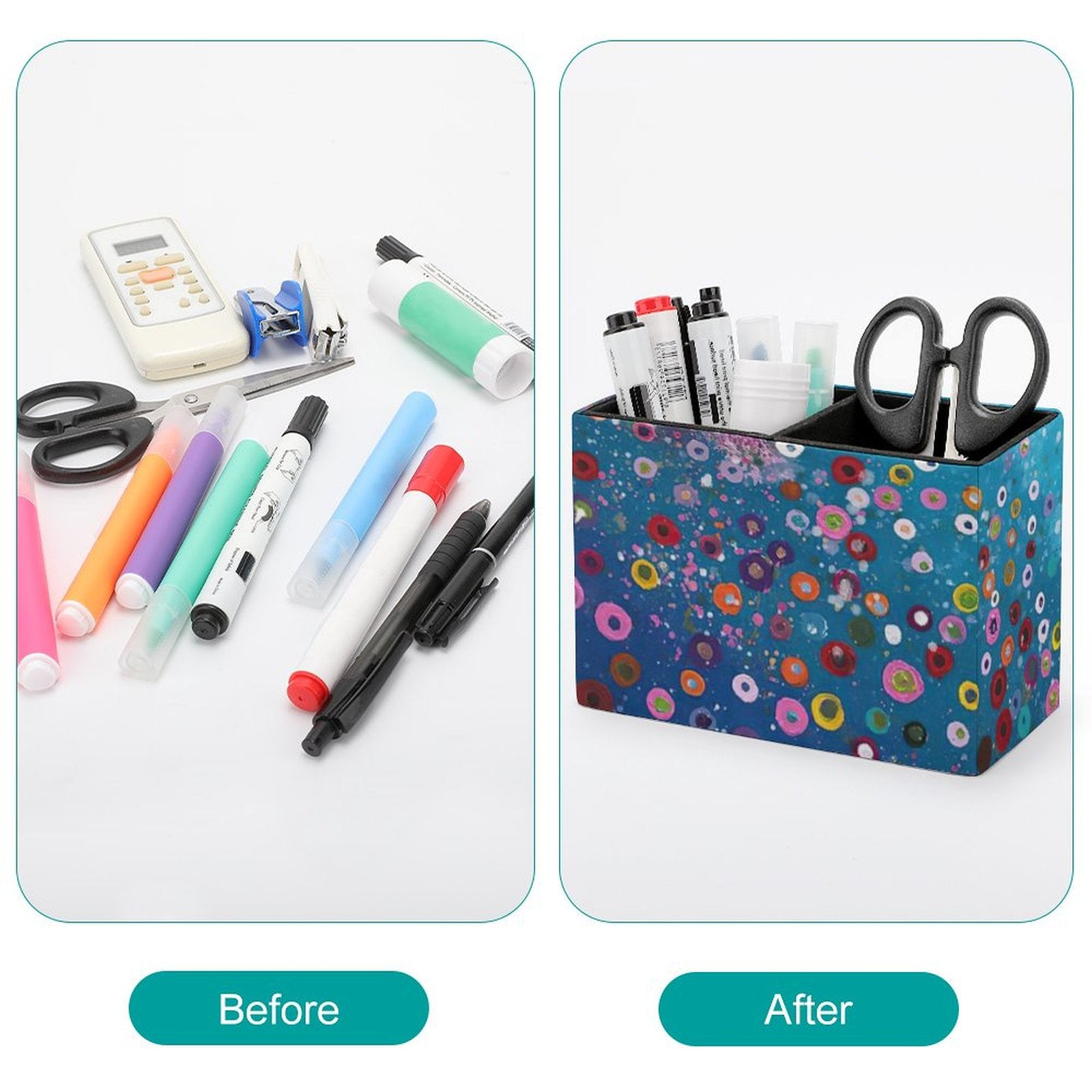 Ora, immagina la stessa scrivania, ma trasformata. Al posto del caos, c'è un unico, elegante oggetto che funge da palcoscenico per i tuoi strumenti. Ogni penna, ogni pennello, ogni accessorio è esposto con ordine, come un attore pronto a entrare in scena. Il disordine è svanito, sostituito da un senso di controllo, professionalità ed eleganza. (After)