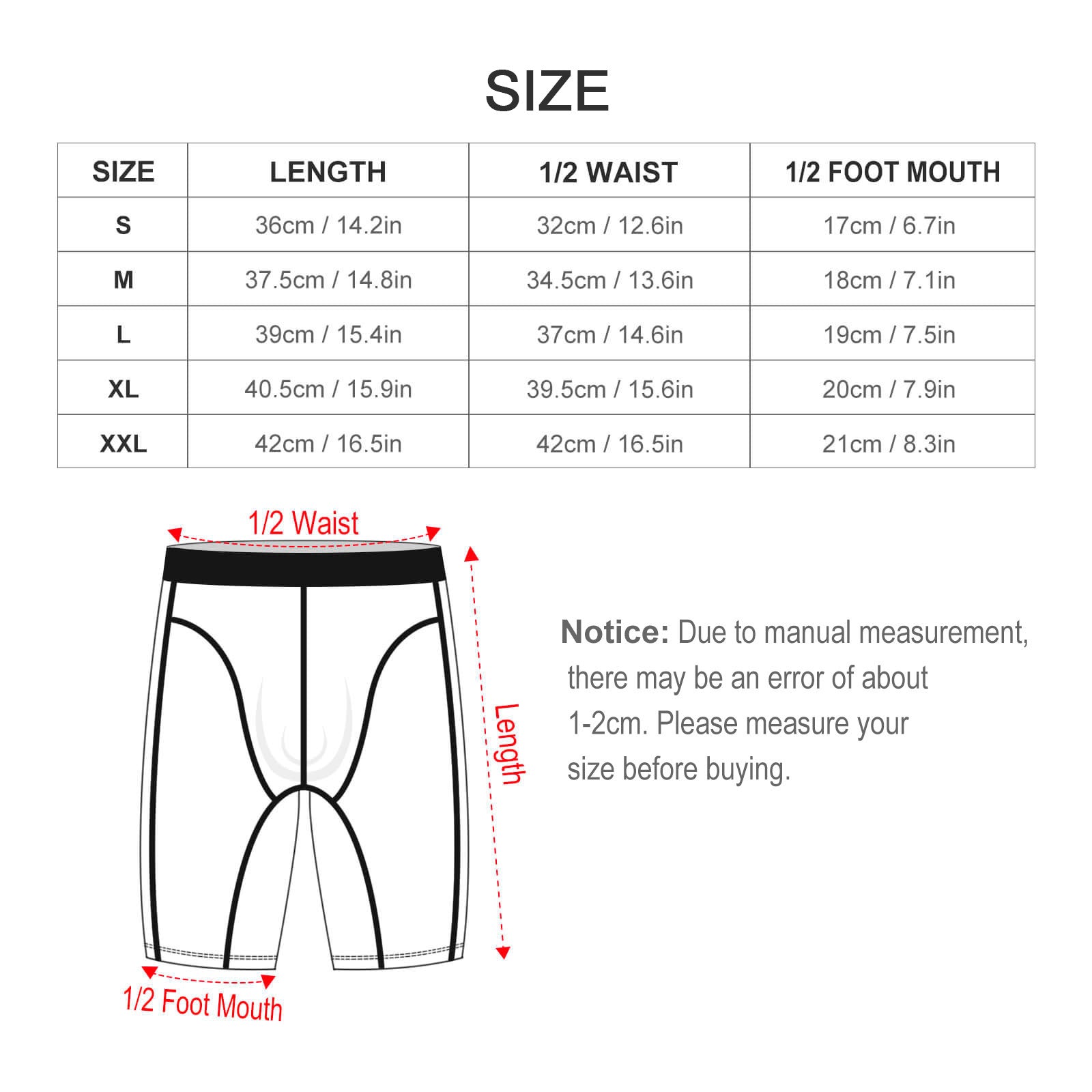 Taglia | Lunghezza (cm/in) | 1/2 Girovita (cm/in) | 1/2 Apertura Gamba (cm/in) |