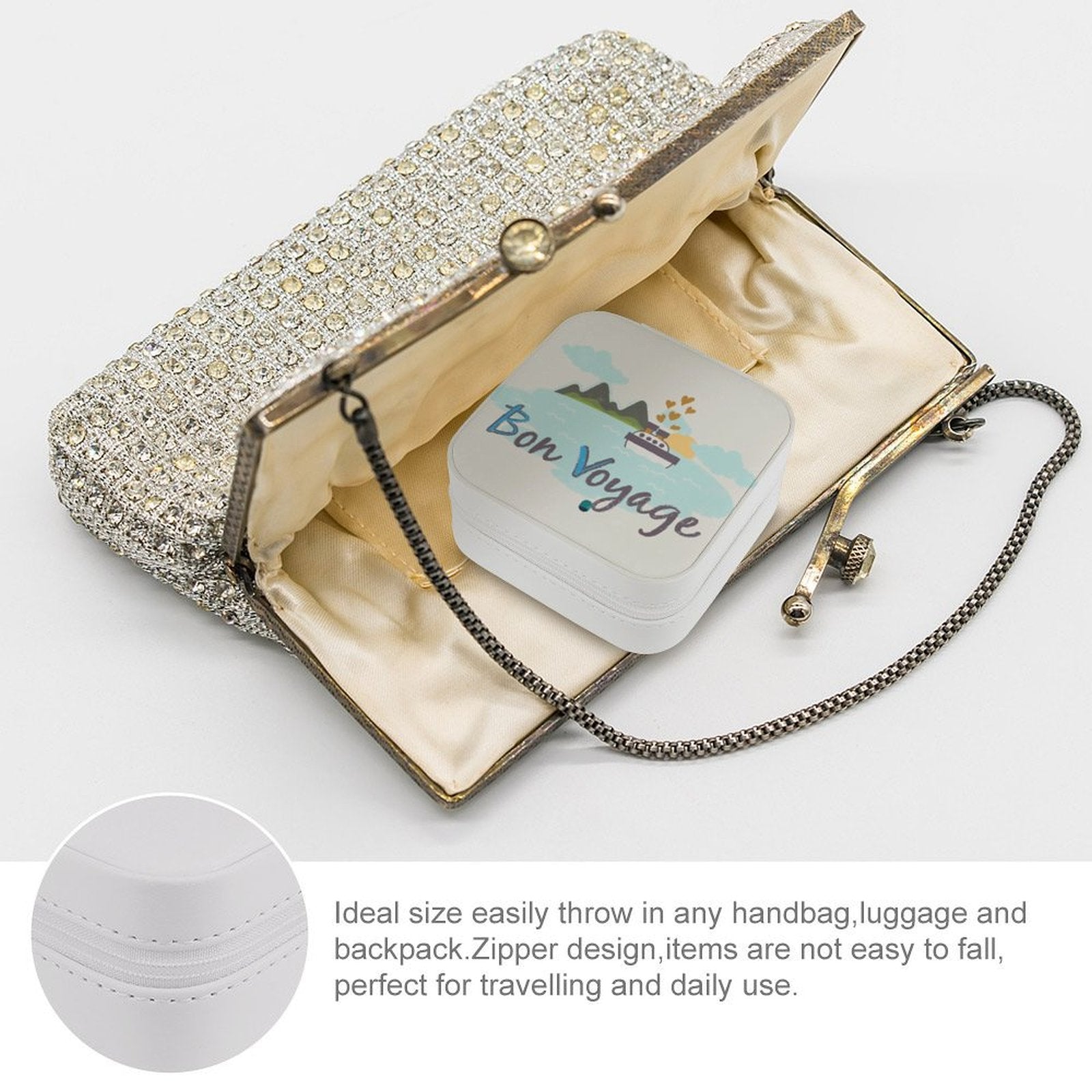 Ora, immagina di essere arrivata a destinazione. Apri la tua valigia ed estrai un piccolo, elegante cofanetto quadrato che porta impressa un'immagine che ami. Apri la cerniera e... la serenità. Ogni collana è al suo posto, ogni anello brilla nel suo alloggiamento, ogni orecchino ha il suo gemello. Tutto è visibile, protetto e pronto per essere indossato. Il tuo stile, intatto e senza stress.